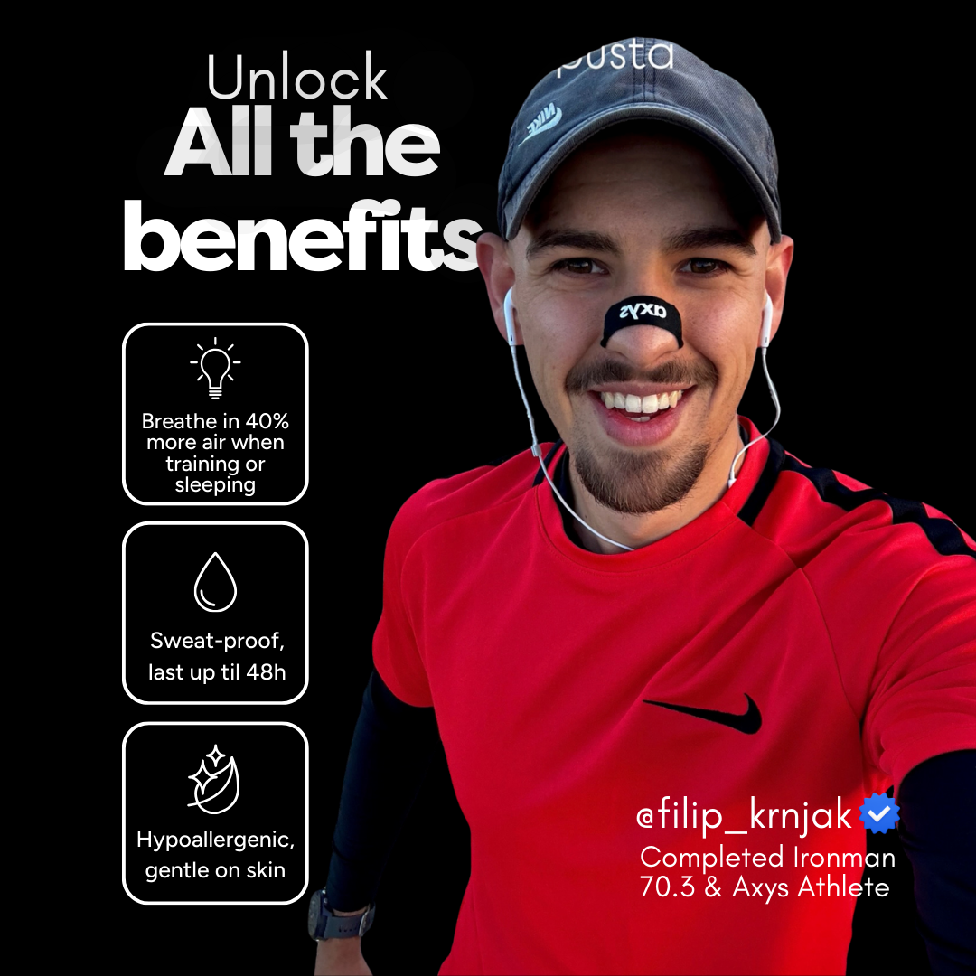 Axys Performance Tape features stronger sports-grade adhesive resistant to sweat and heat, a new shape that allows the skin under the nose to breathe,